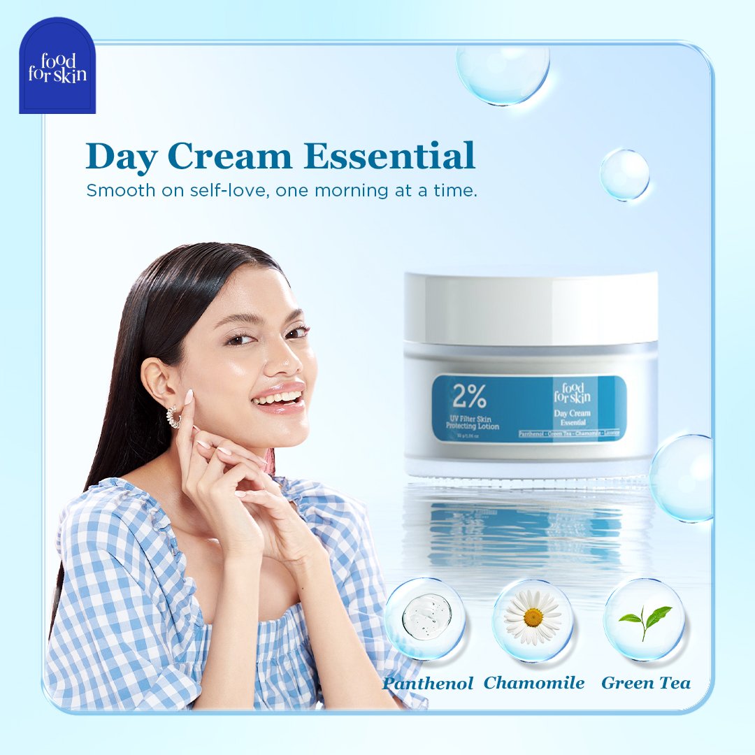 Food For Skin Essentials Day Cream is a lightweight daily moisturizer formulated with panthenol, chamomile extract, green tea, and licorice extract to help nourish, soothe, and brighten the skin. Suitable for all skin types and recommended for dull skin and uneven texture, it helps maintain skin hydration while absorbing quickly for comfortable daytime wear. Halal certified and BPOM registered, this 15 ml day cream supports a healthy, smooth, and refreshed complexion.